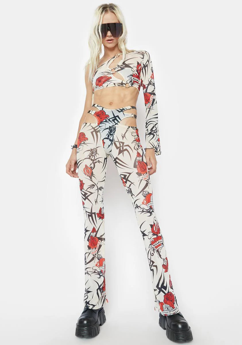 Beige Tattoo Rose Speed Racer Mesh Pants