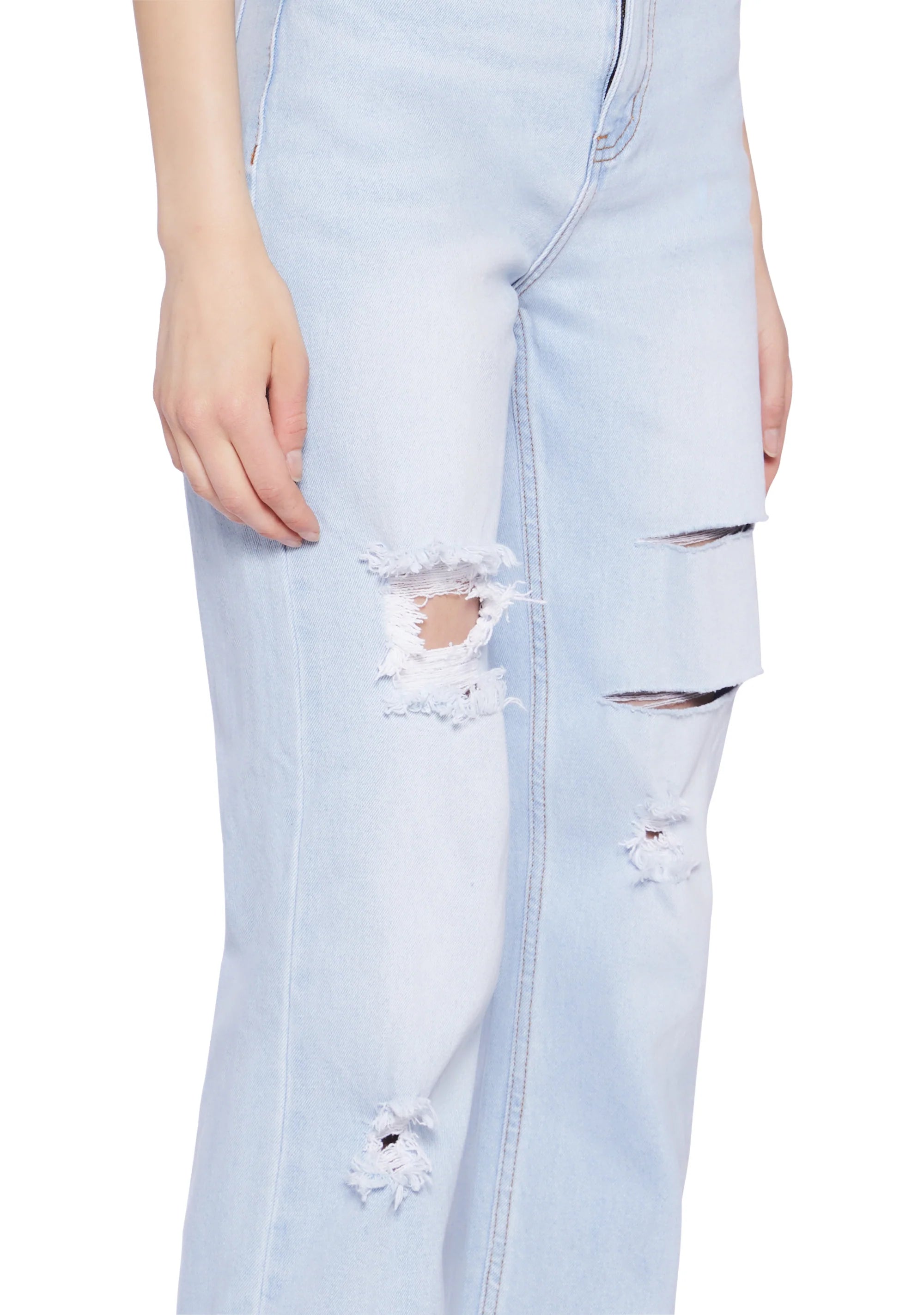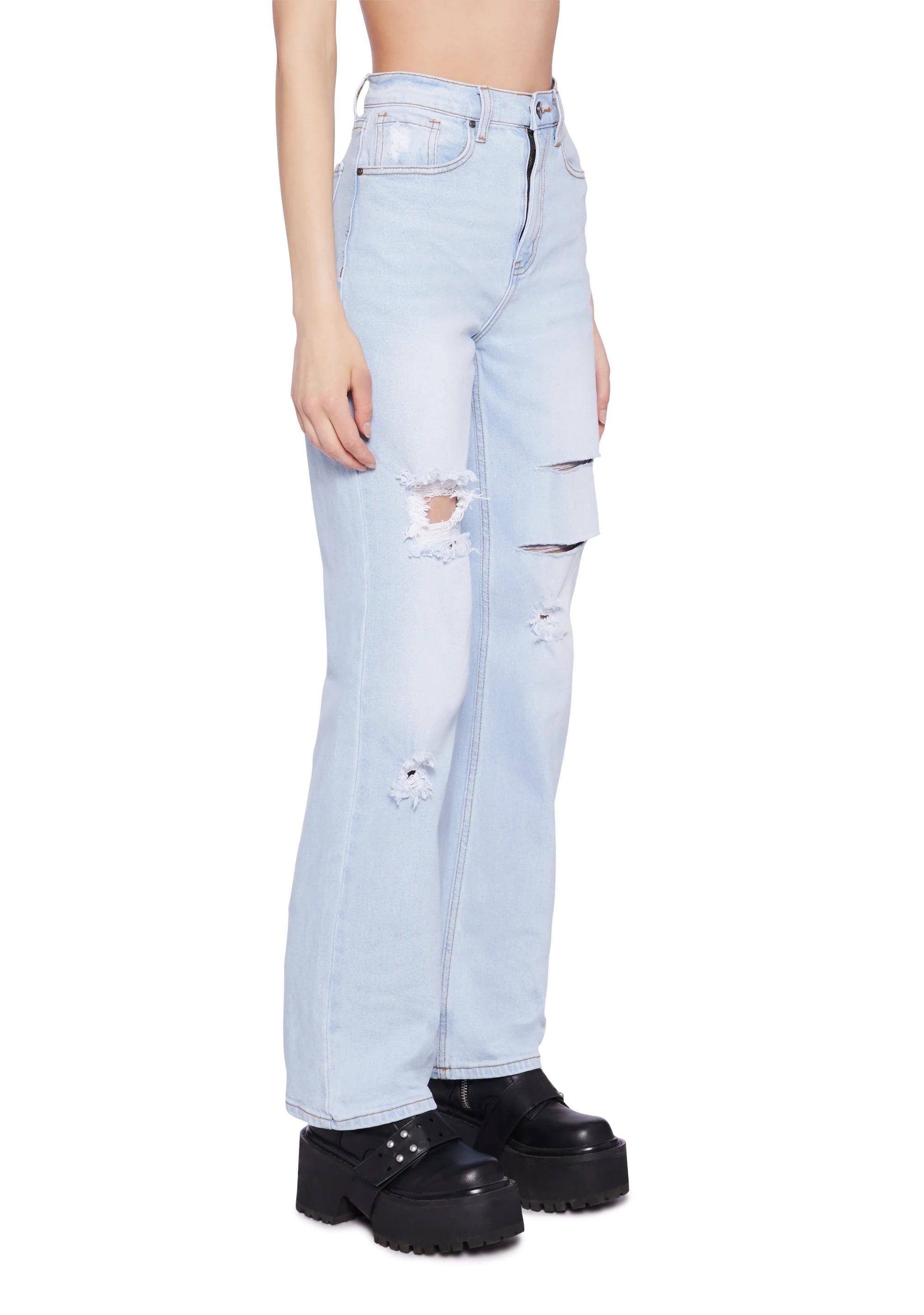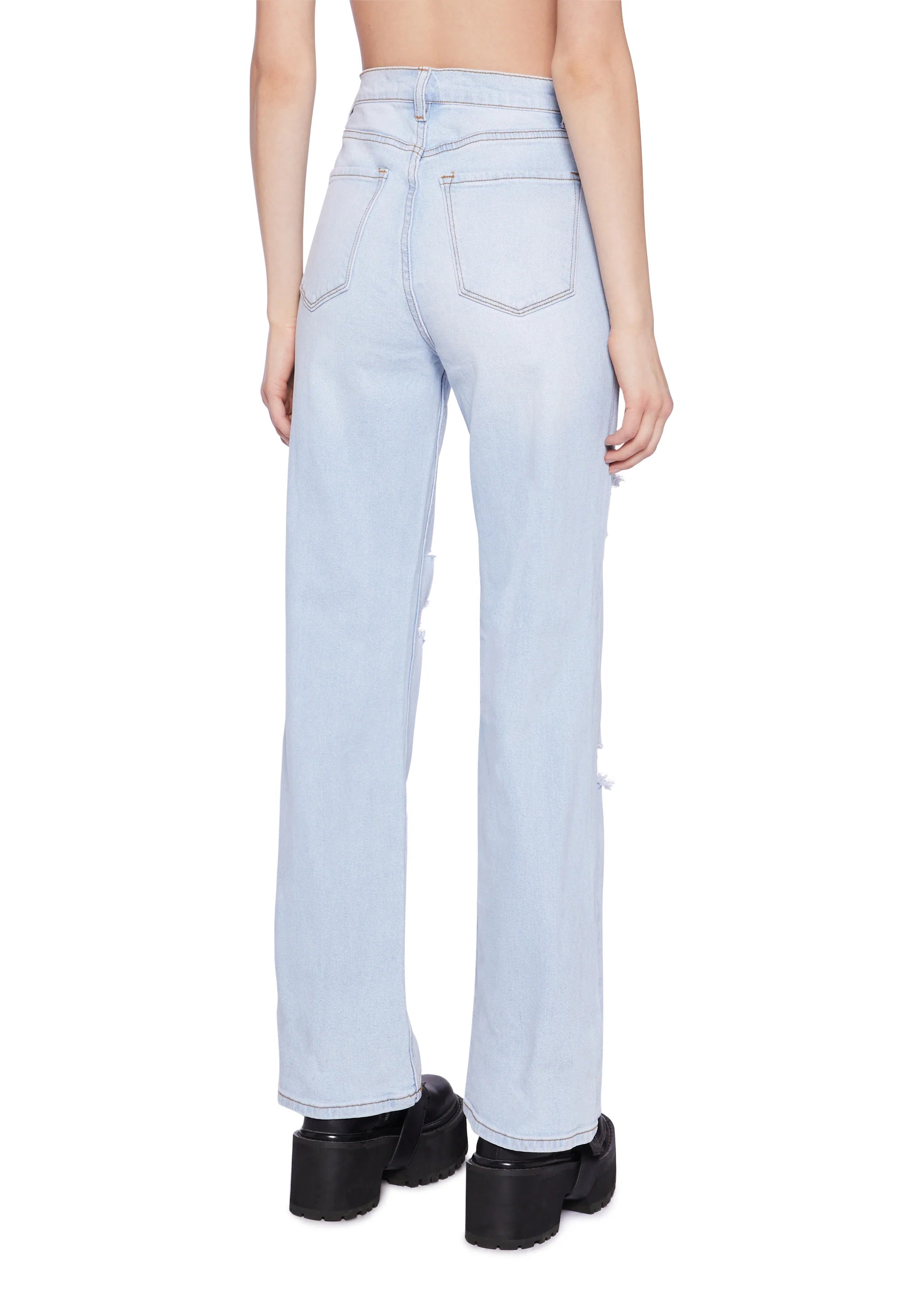 Distressed High Rise Straight Denim Jeans - Light Blue