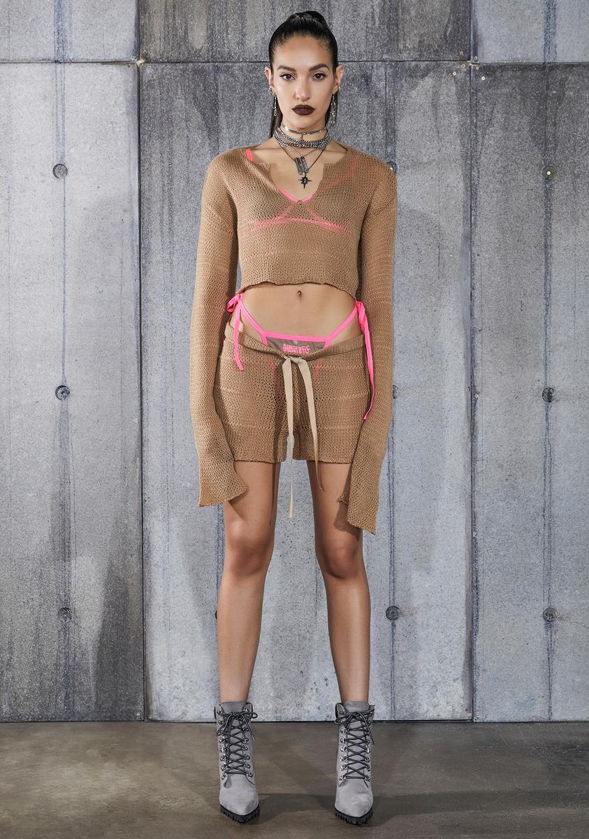 Snare Tan Cropped Longer Sleeve Sheer Knit Sweater