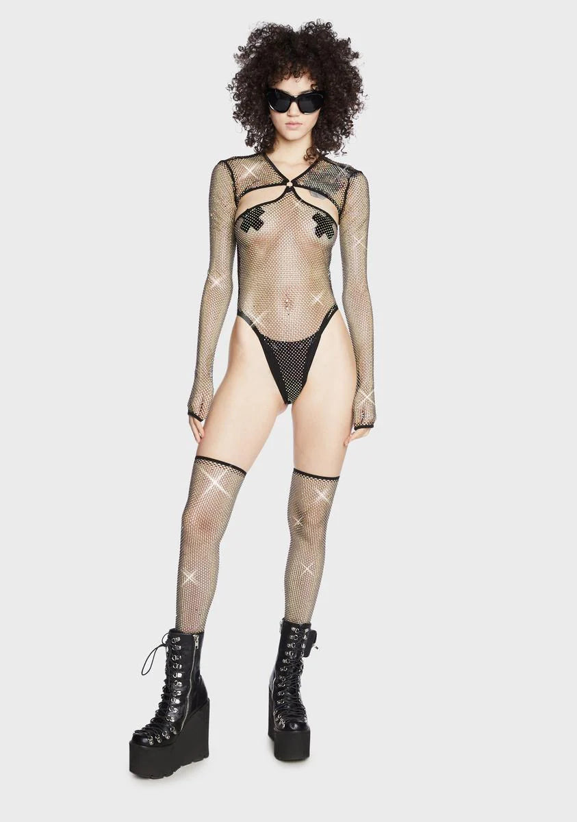 Starry Dancer Rhinestone Fishnet Bodysuit And Thigh High Stockings Set
