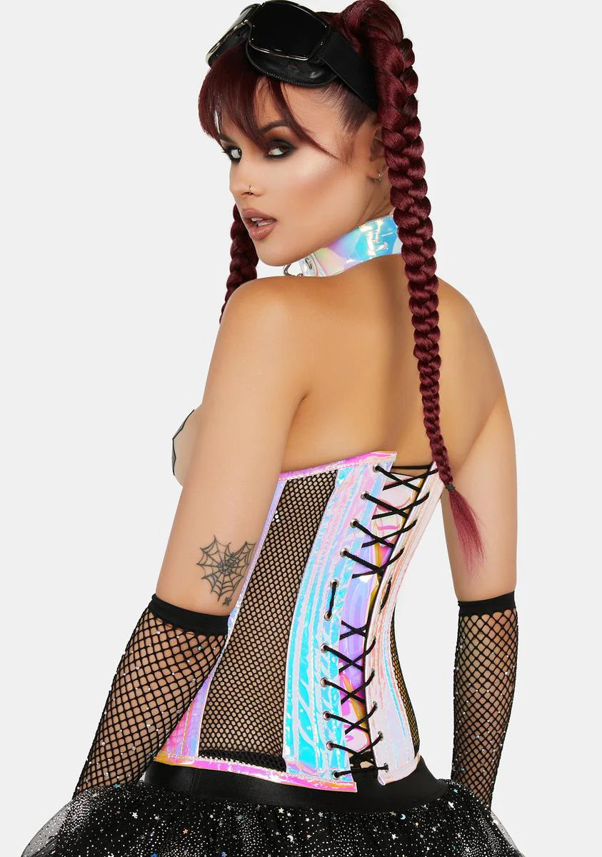Top Drawer Holographic & Fishnet Steel Boned Under Bust Corset